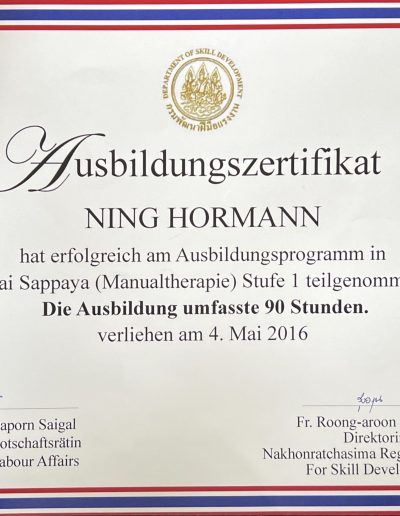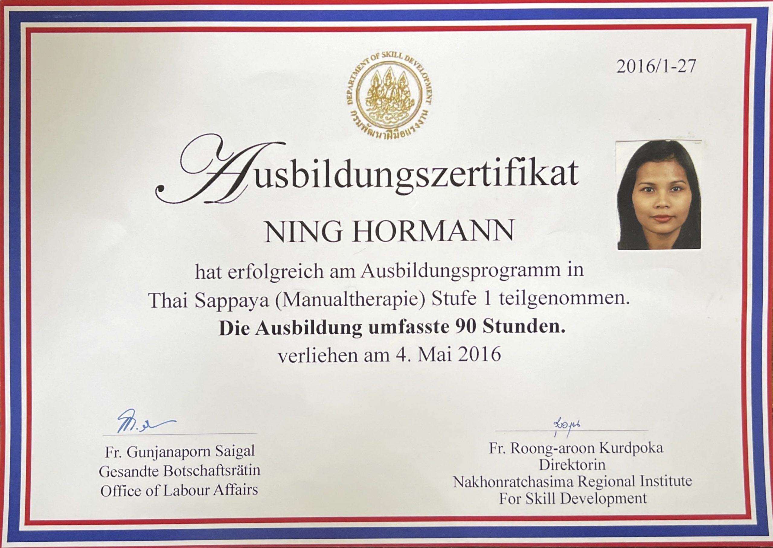 Ich heiße Ning Hormann. Durch meine Ausbildung in der klassischen thailändischen Massage und über 10 Jahre Berufserfahrung in den besten Premium Thai Massagen Berlins, habe ich das Wissen und die Expertise, gezielt auf Ihre individuellen Bedürfnisse einzugehen.